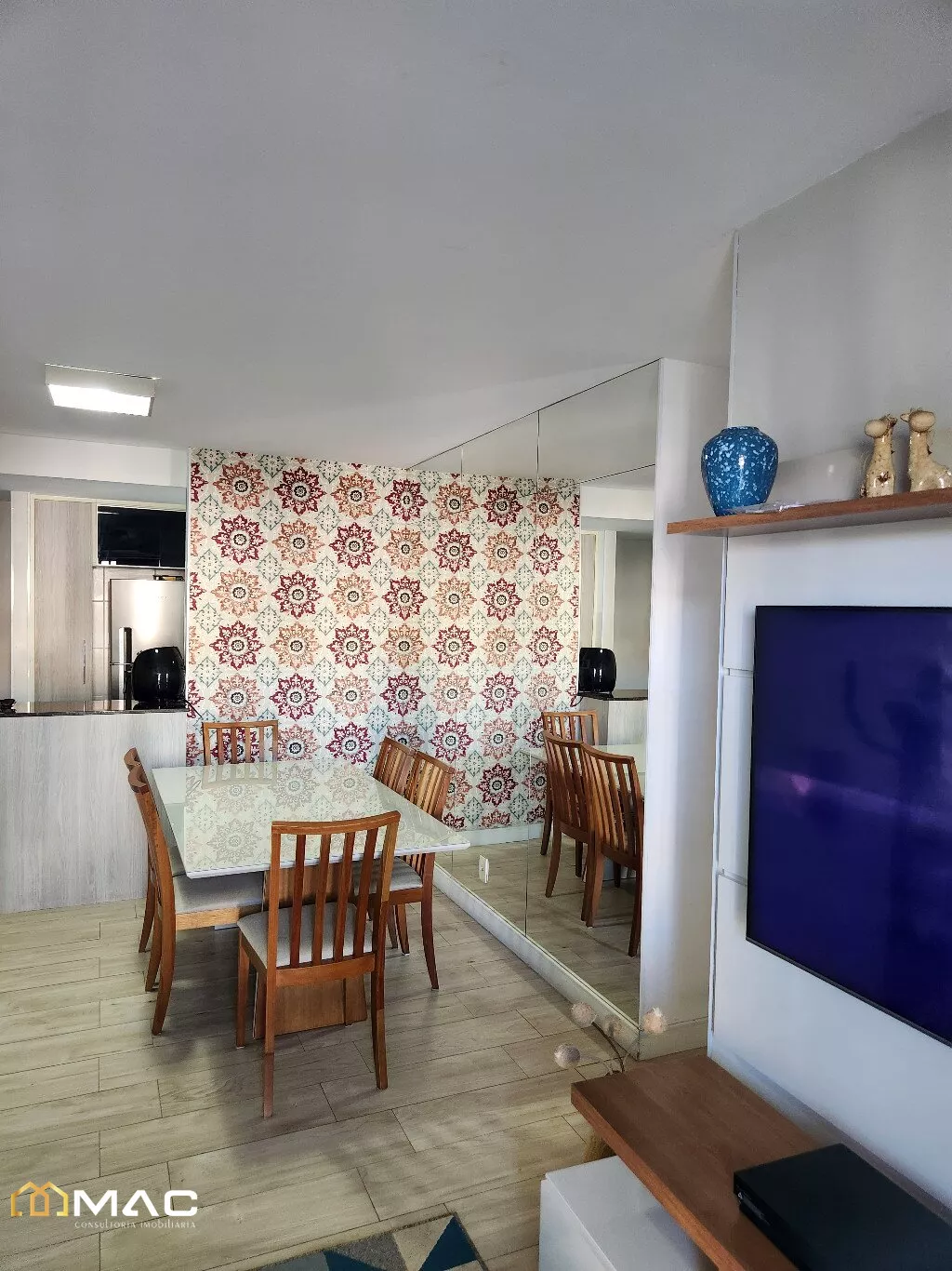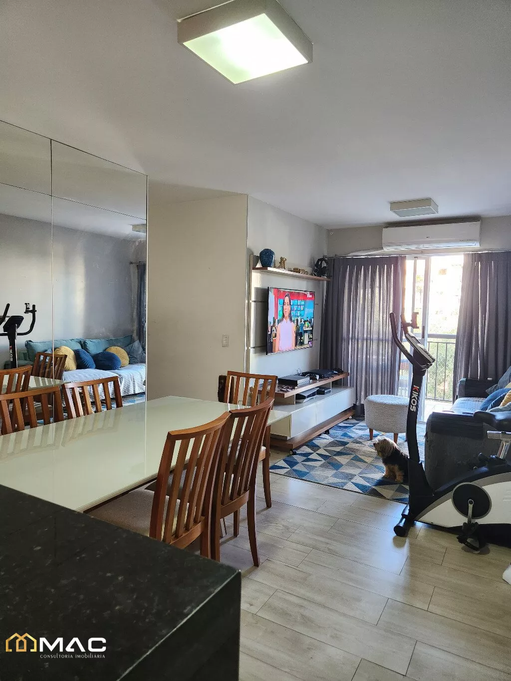 Sala em dois ambientes, com acesso a varanda com piso em cerâmica e luminárias.