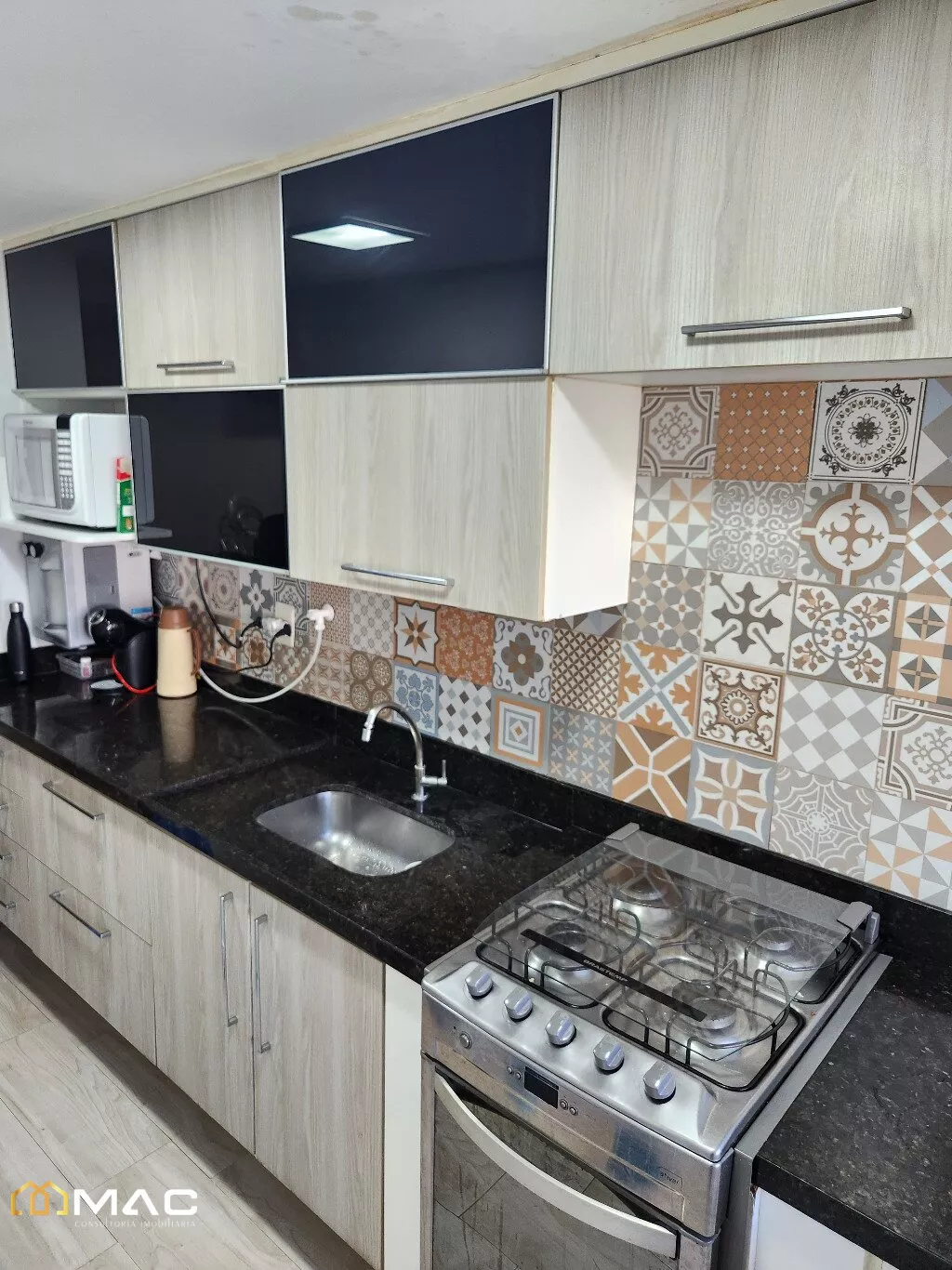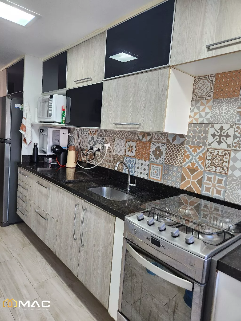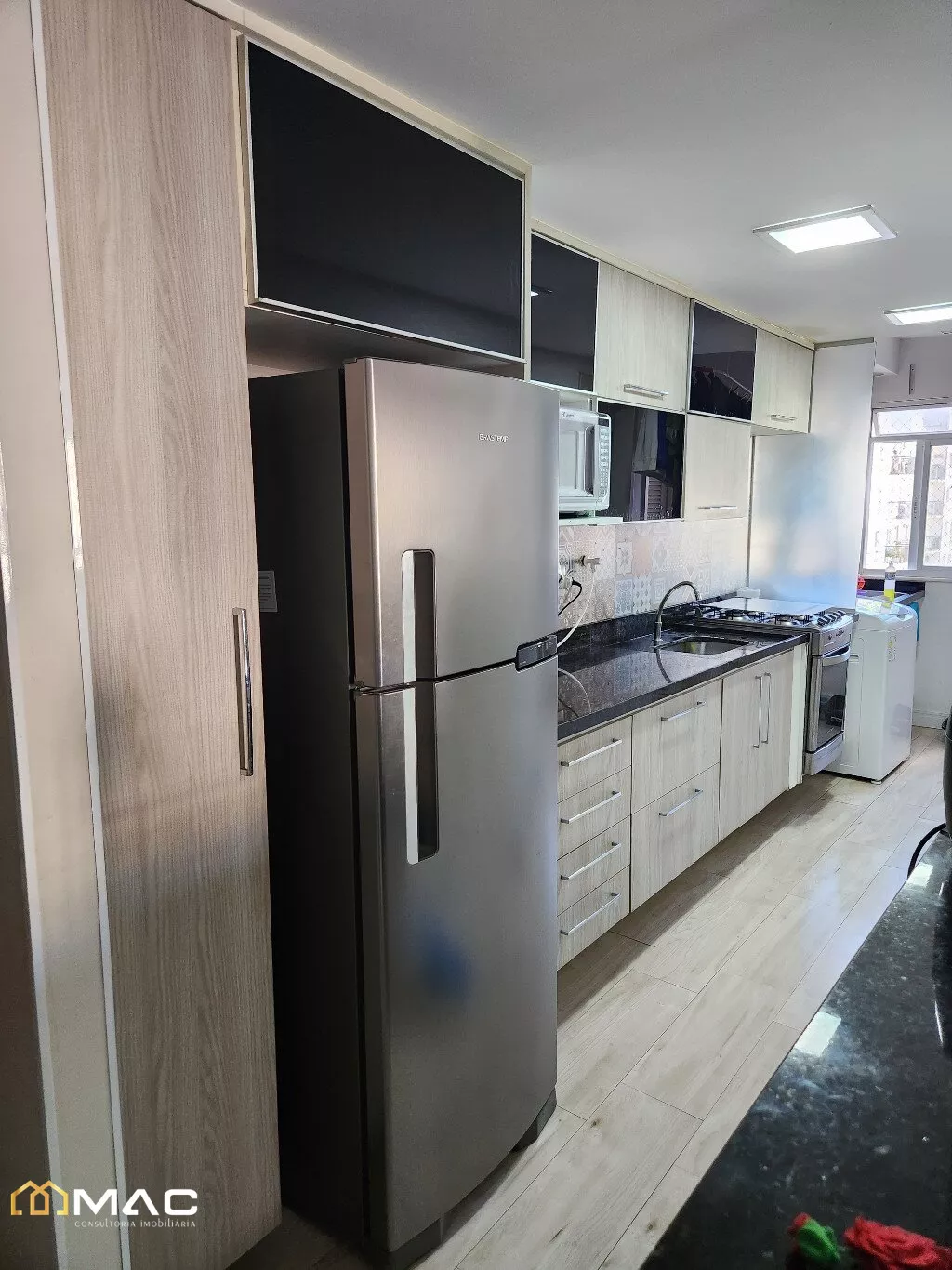 Cozinha Gourmet, com armários planejados, com luminárias, interfone e área com janela e aquecedor.