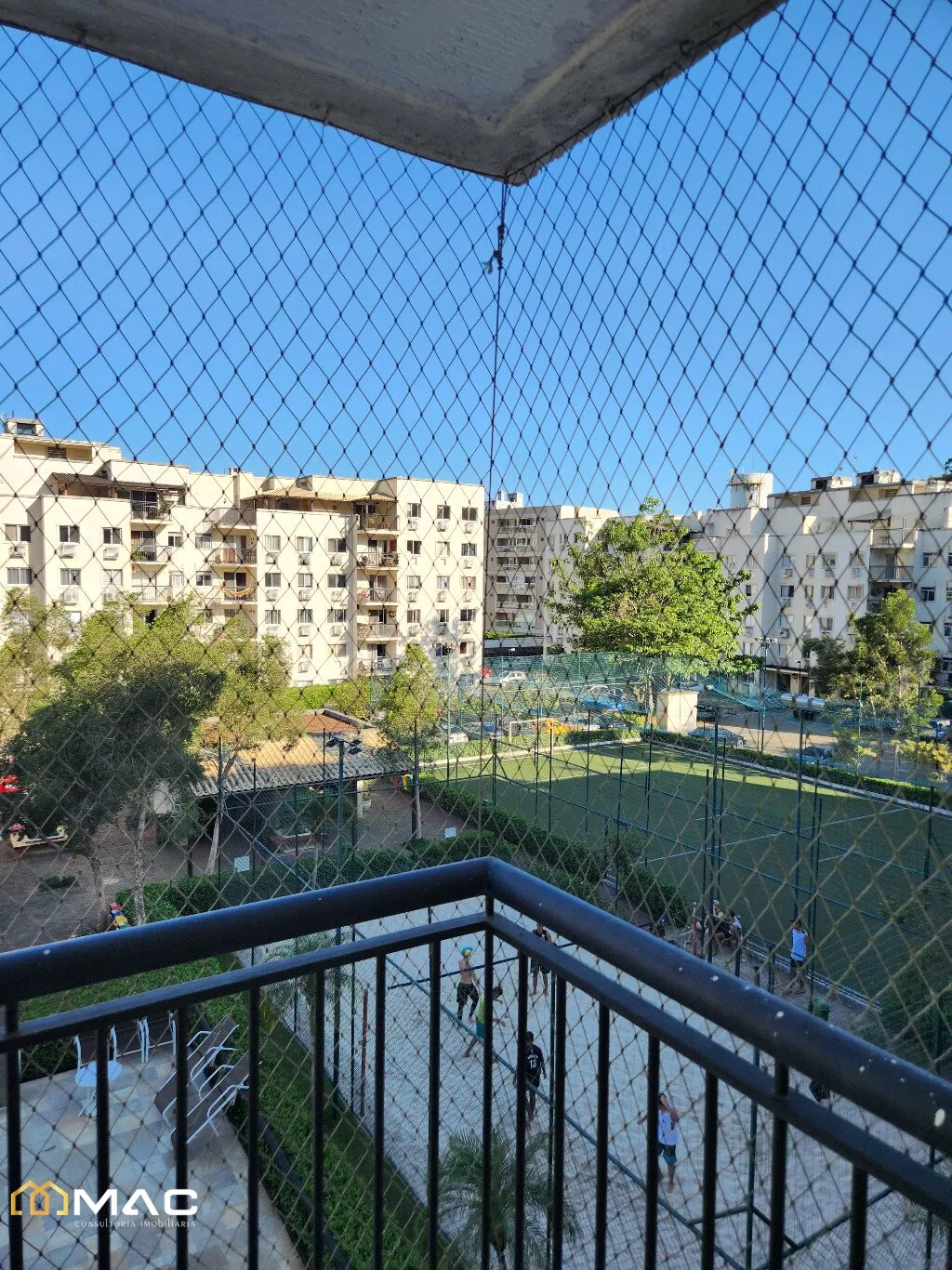 Campo de areia e de futebol de grama sintética.
