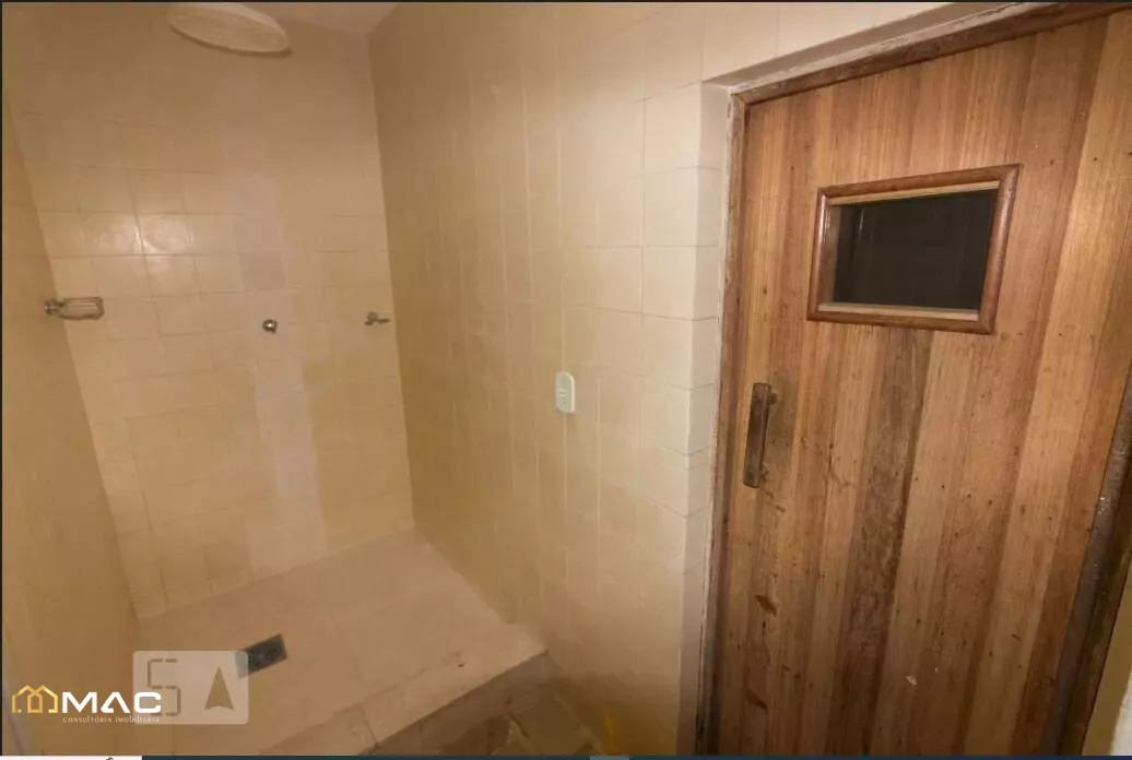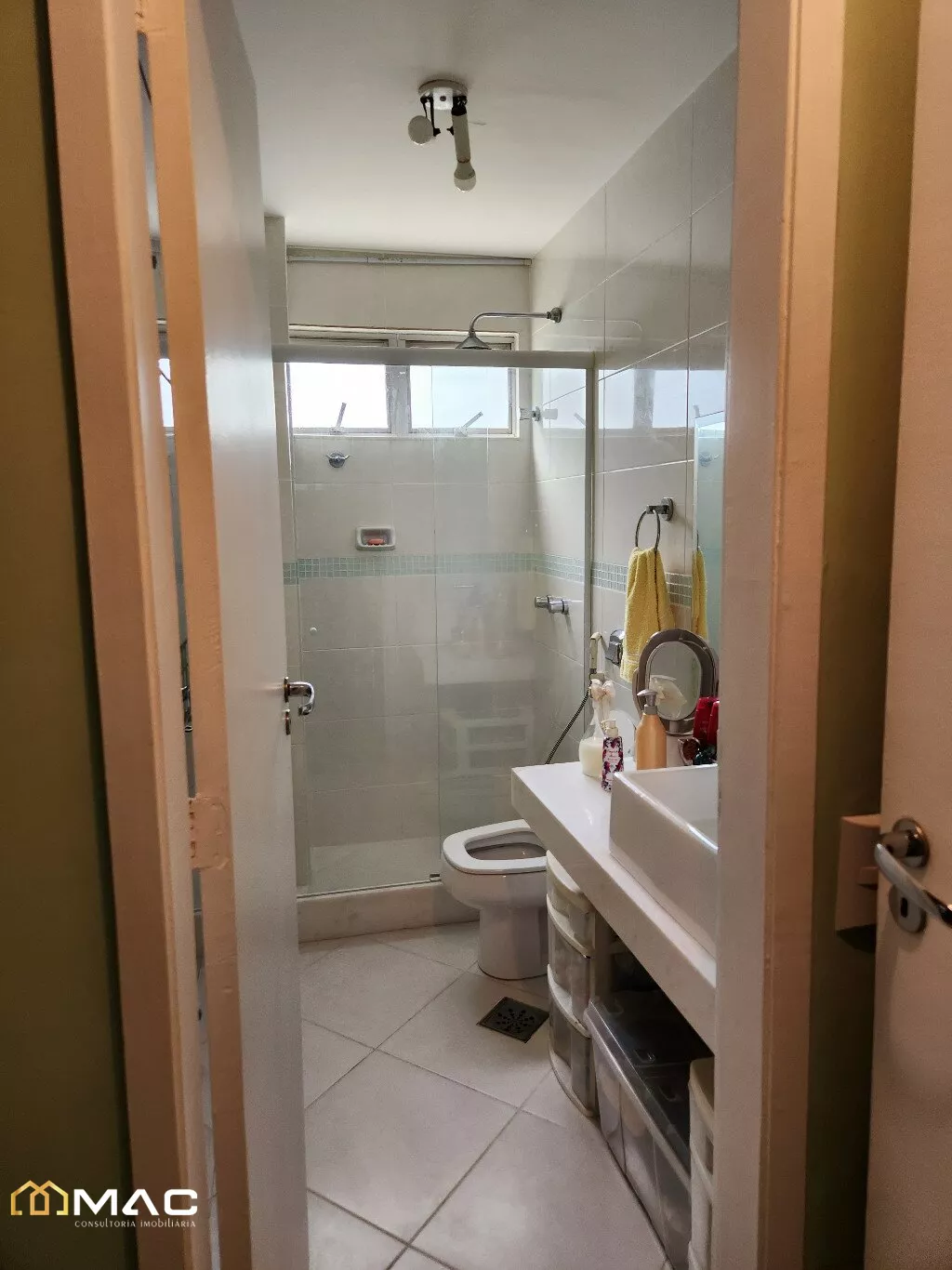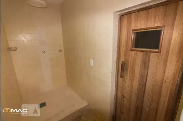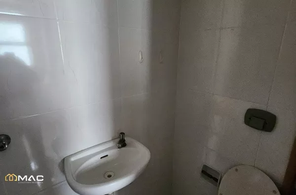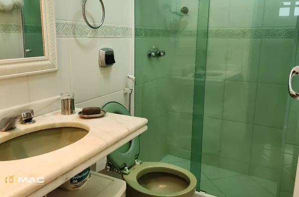 Banheiros com box blindex, iluminação e abancada em granito, com azulejos nas paredes e piso em cerâmica em bom estado.