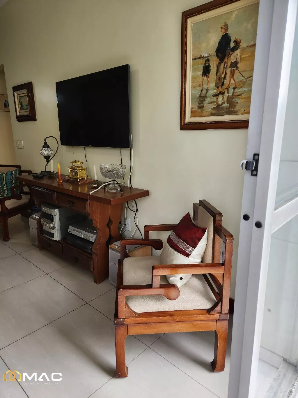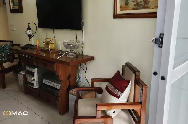 Sala em dois ambientes bem espaçosa com ar split, sofá , rack, mesa com 04 cadeiras, cadeiras decorativa.