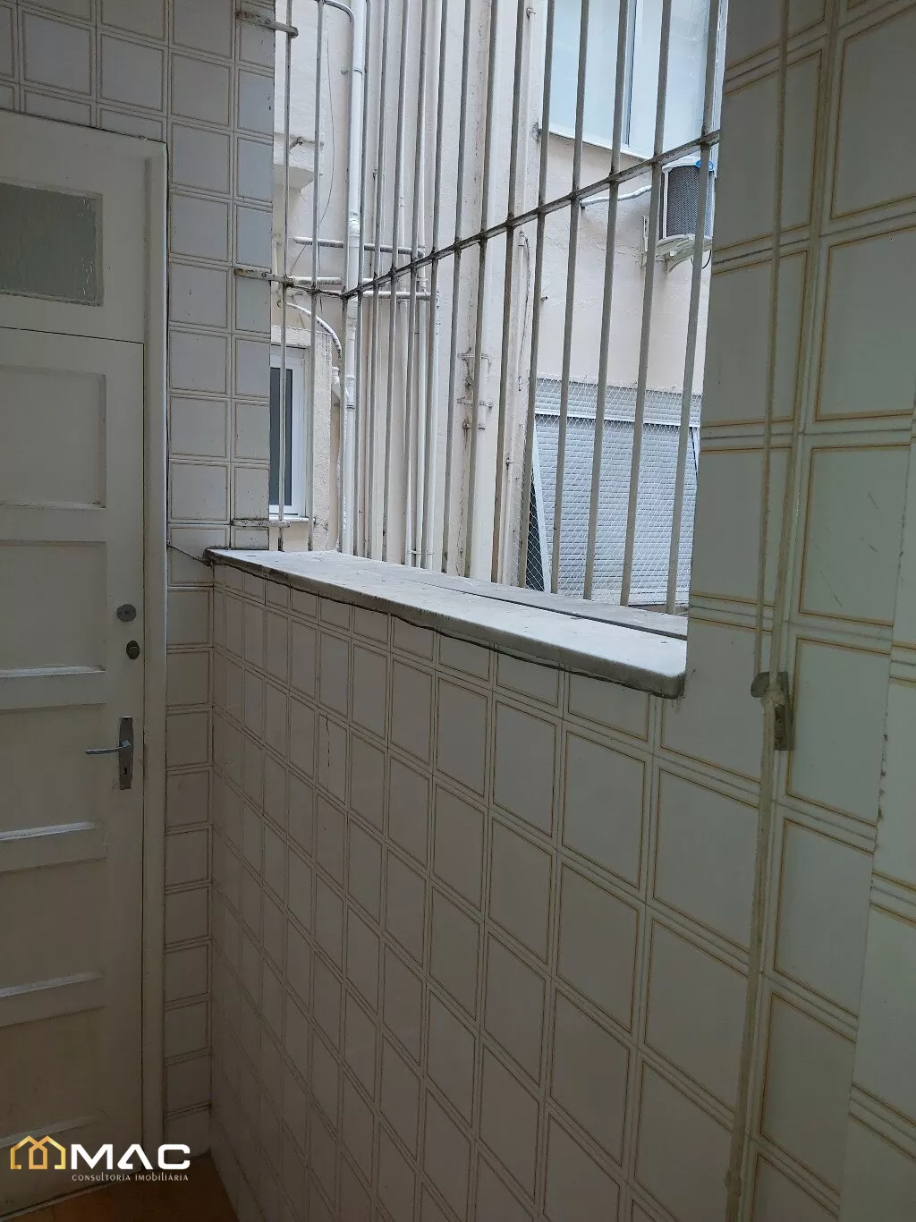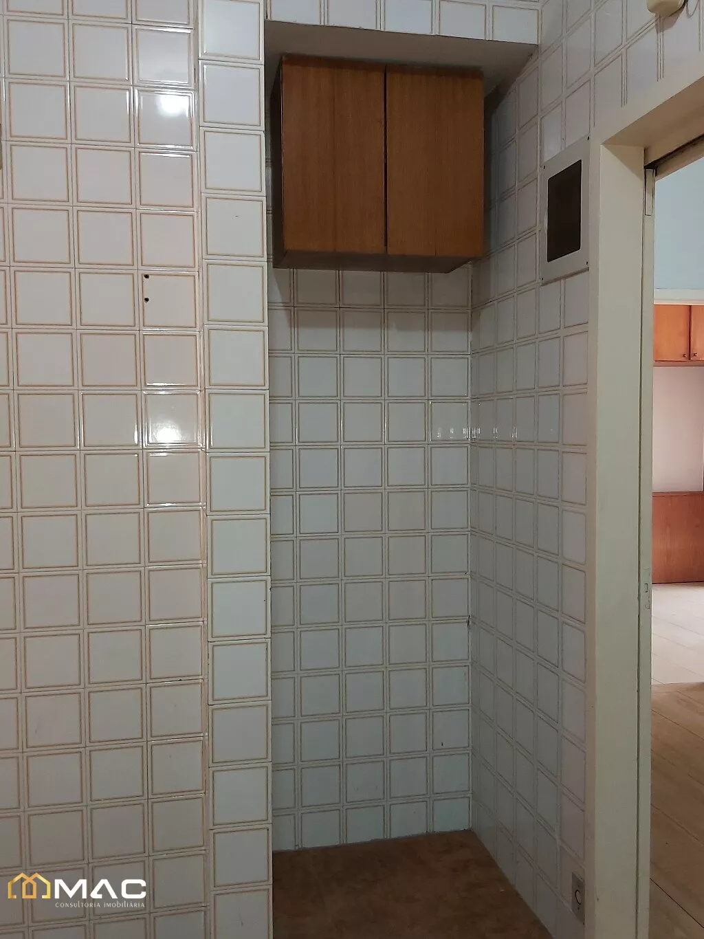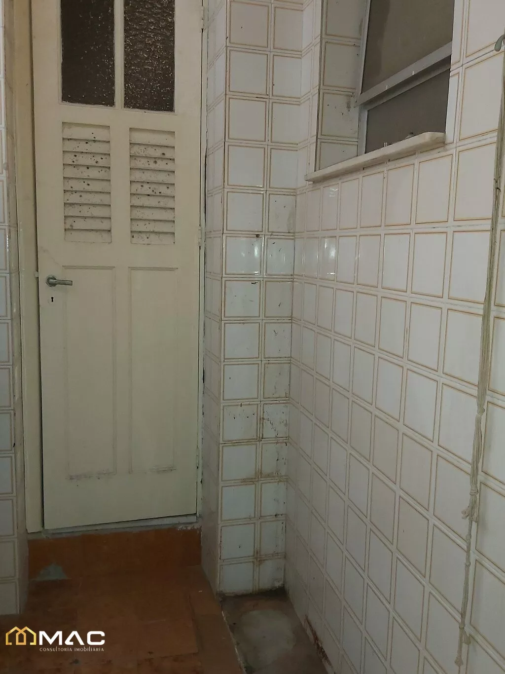 Área de serviço com piso em cerâmica e azulejos nas paredes.