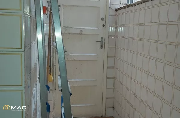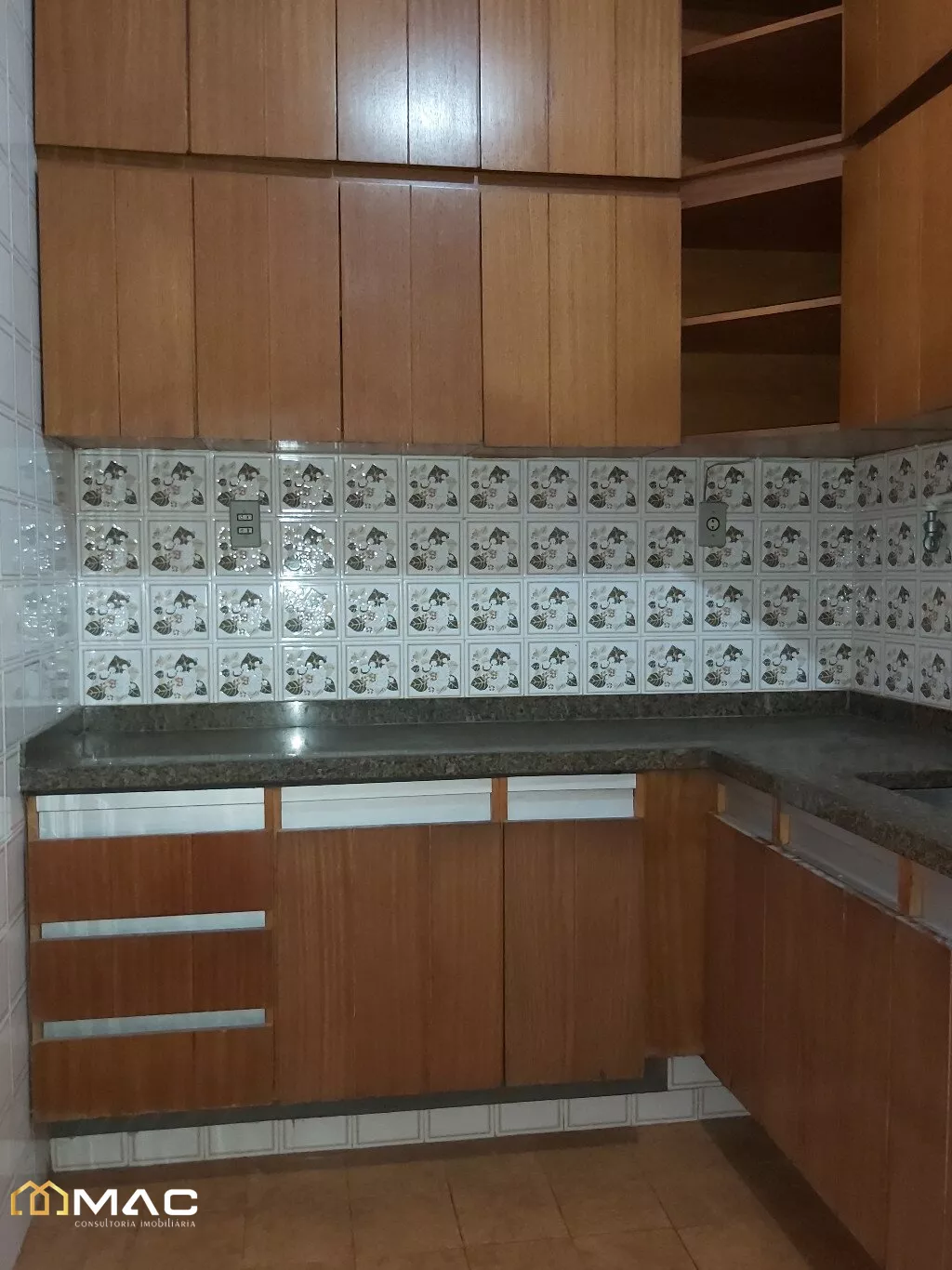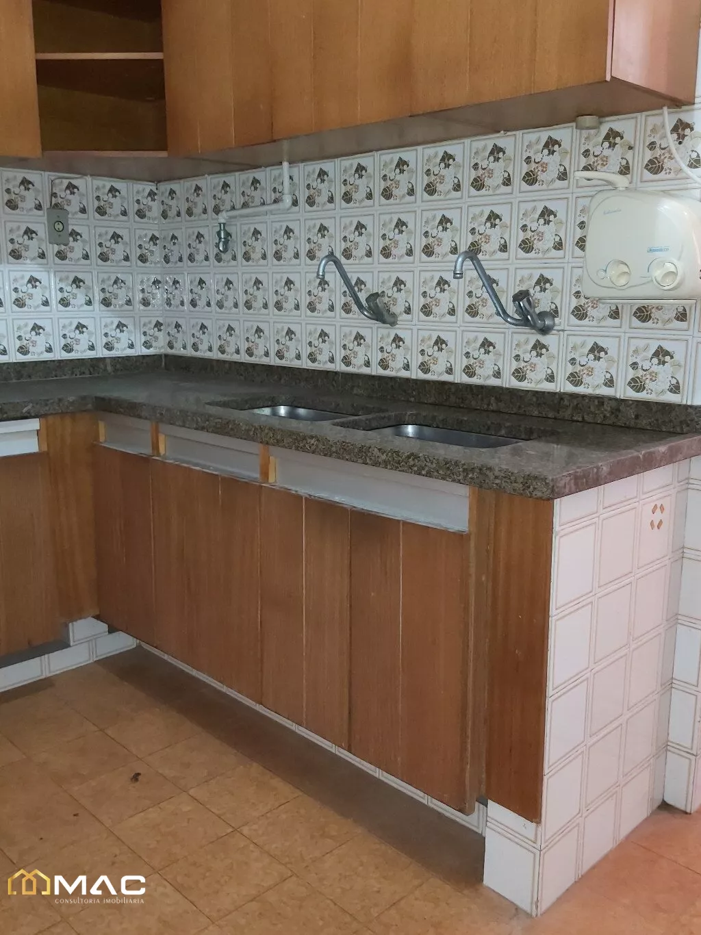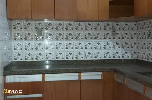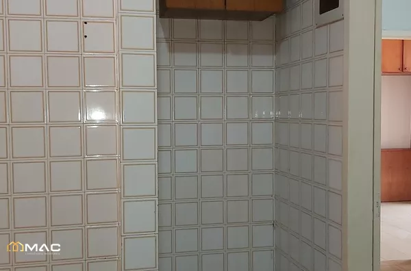Área de serviço com piso em cerâmica e azulejos nas paredes.