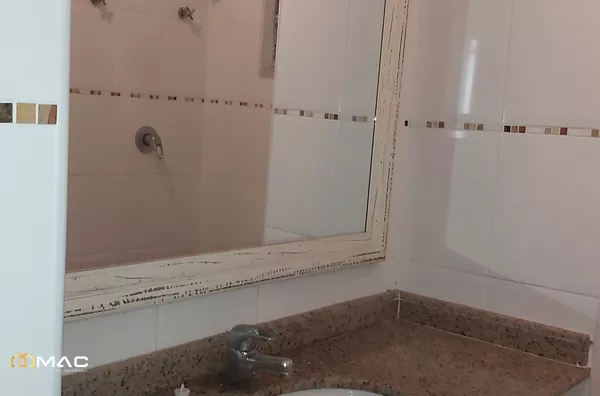Banheiro social com piso em cerâmica e azulejos nas paredes, bancada em granito box amplo.